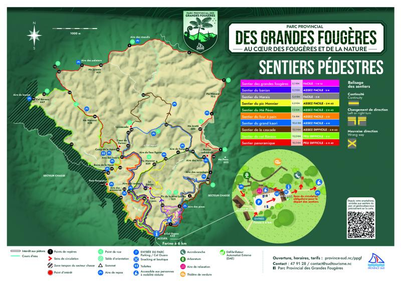 Situé sur les communes de Moindou, Farino et Sarraméa, à 1h30 de Nouméa, le Parc Provincial des Grandes Fougères couvre une superficie de 4 535 ha de forêt tropicale humide, dans la partie Sud d’un massif forestier plus vaste appartenant principalement au domaine privé de la province Sud.