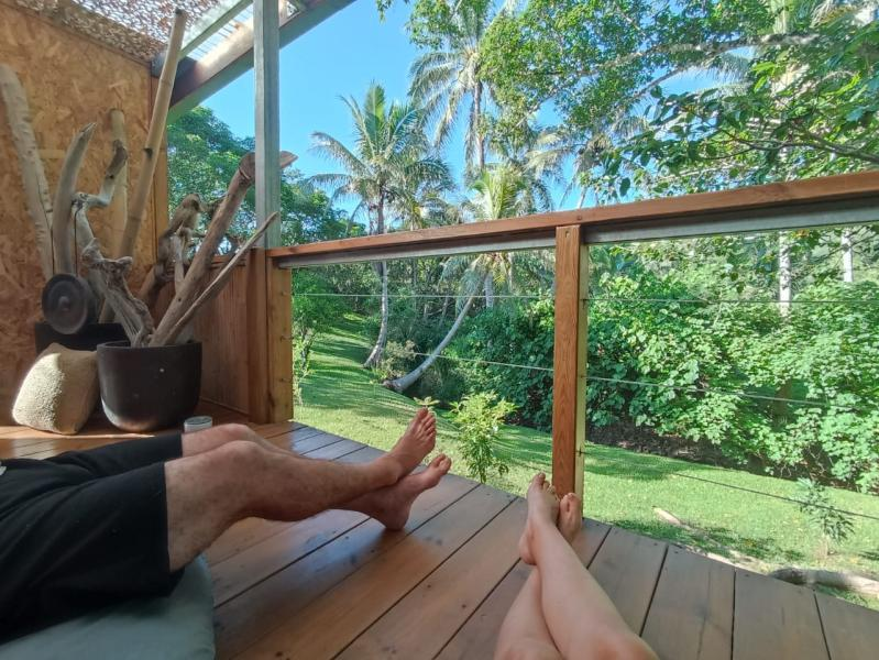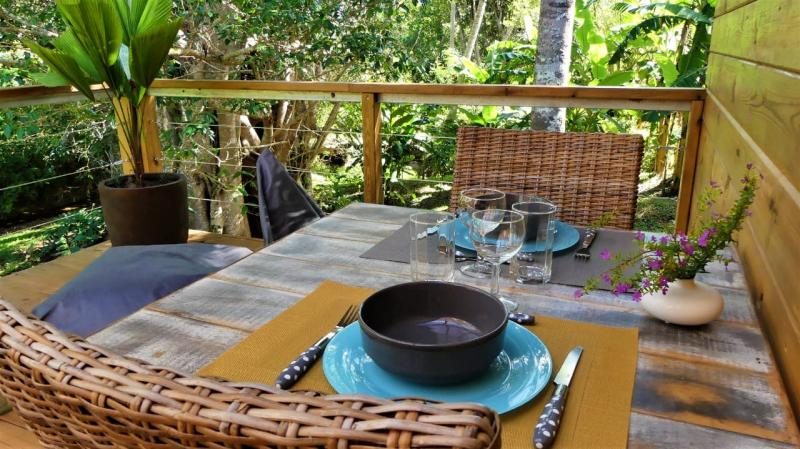 Le couple de jeunes retraités broussards a construit de joli chalet entre deux confinements sanitaires. Le résultat est un petit cocon où il fait bon séjourner à deux, au calme et à l'ombre d'un vieux banian. La décoration est soignée, l'équipement complet : lit double, coin cuisine équipé de micro-onde, frigo, plaques, vaisselle, salle de bain, terrasse zen avec tapis de yoga fourni. Ventilateur et chauffage d'appoint à disposition ainsi que le Wifi. Le bungalow en bois est idéal pour une escapade nature en toute autonomie. L'accueil de Sylvie et Jean-Jacques est attentionné. Le creek qui s'écoule en bas du terrain confère encore plus de charme au lieu.